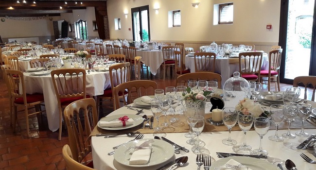 Cette salle de réception vous accueille pour le dîner. Son plafond voûté en briques anciennes sur la moitié de la pièce et la charpente apparente sur l'autre moitié en font une salle de réception pleine de charme et de rusticité.