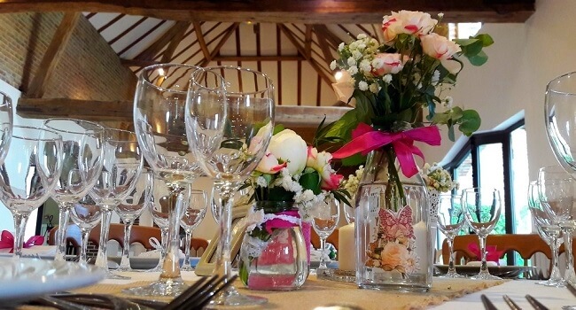Cette grange avec sa charpente en bois traditionnelle et son pourtour en briques anciennes laissera vos invités admirer la vue sur le soleil couchant. Piste de danse pour votre soirée.