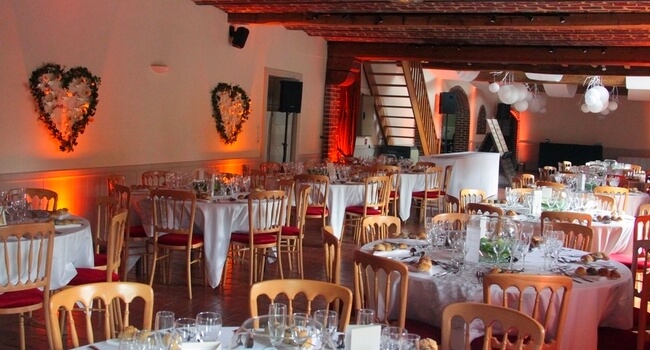 Cette salle de réception vous accueille pour le dîner. Son plafond voûté en briques anciennes sur la moitié de la pièce et la charpente apparente sur l'autre moitié en font une salle de réception pleine de charme et de rusticité.